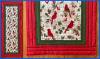 Bird Song Runner/Wall Hanging: This 38" X 14" runner/wall haning features a stunning cardinals with berries and leaves with a sheet music background print. The inner border is green and metallic gold dot. The outer border is a perfectly coordinating red and black print. The back hanging sleeve allows it to do double duty as a wall hanging. |