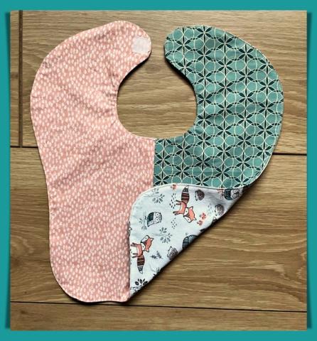 I bet you know a little someone who would look adorable in this bib. One side features a pastel peach tone teamed up with a light blue print. It reverses to acute woodland creatures print that includes foxes, owls and hedgehogs on a white background. .