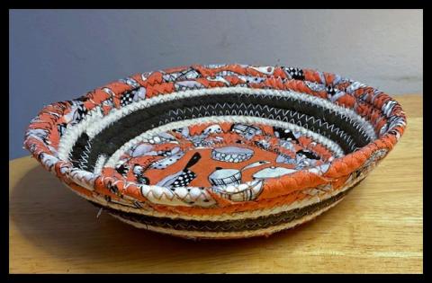 How much fun is this Kitschy black and white basket on an amber background featuring pots and pans? Off white and black stripes add drama and contrast. 6" across the top and 1.5" deep.