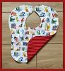 BIB-ABC's: Make feeding time fun with this colorful bib. It features a multi colored print with animals and ABC's on a white background. It reverses to a red stripe print. |