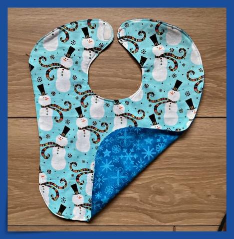 Bet you know a little someone who would look adorable in this bib. A fun wintertime print featuring snow people with coloful scarves on a light blue background reverses to a medium blue snowflafe print with a bit of sparkle.