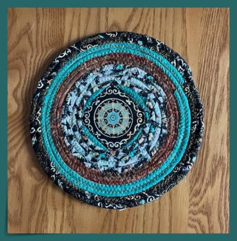 ![]() At the heat of this attractive mat/trivet is an appliqued Indian inspired tile that rests of a light teal print with metalic gold highlights. It is surrounded by a fun textured white and black print with a hint of teal and light brown which adds. Next in line is a perfectly coordinating brown batick. The light teal/mantallic gold fabric is then repeated before the outer border which brings the Indian inspired print back into play. |