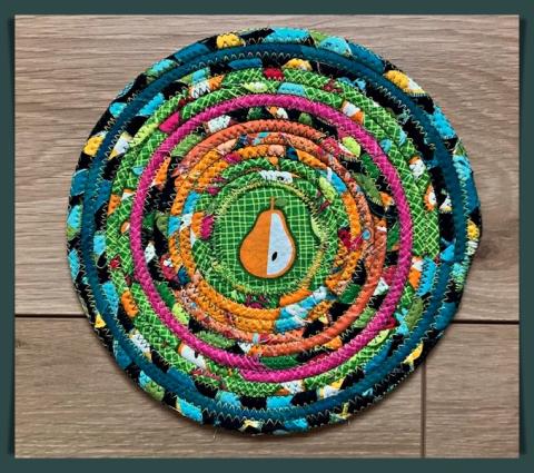 ![]() This scrappy mat/trivet starts out with an appliqued pear in the center. It then works it's way through several cheery prints in various shades of green, blue, cherry red, cheddar and hot pink. The outer edge brings in a darker color way with dark and light teal, olive green and yellow on a black background. The perfect way to add a splash of color to your decor. |